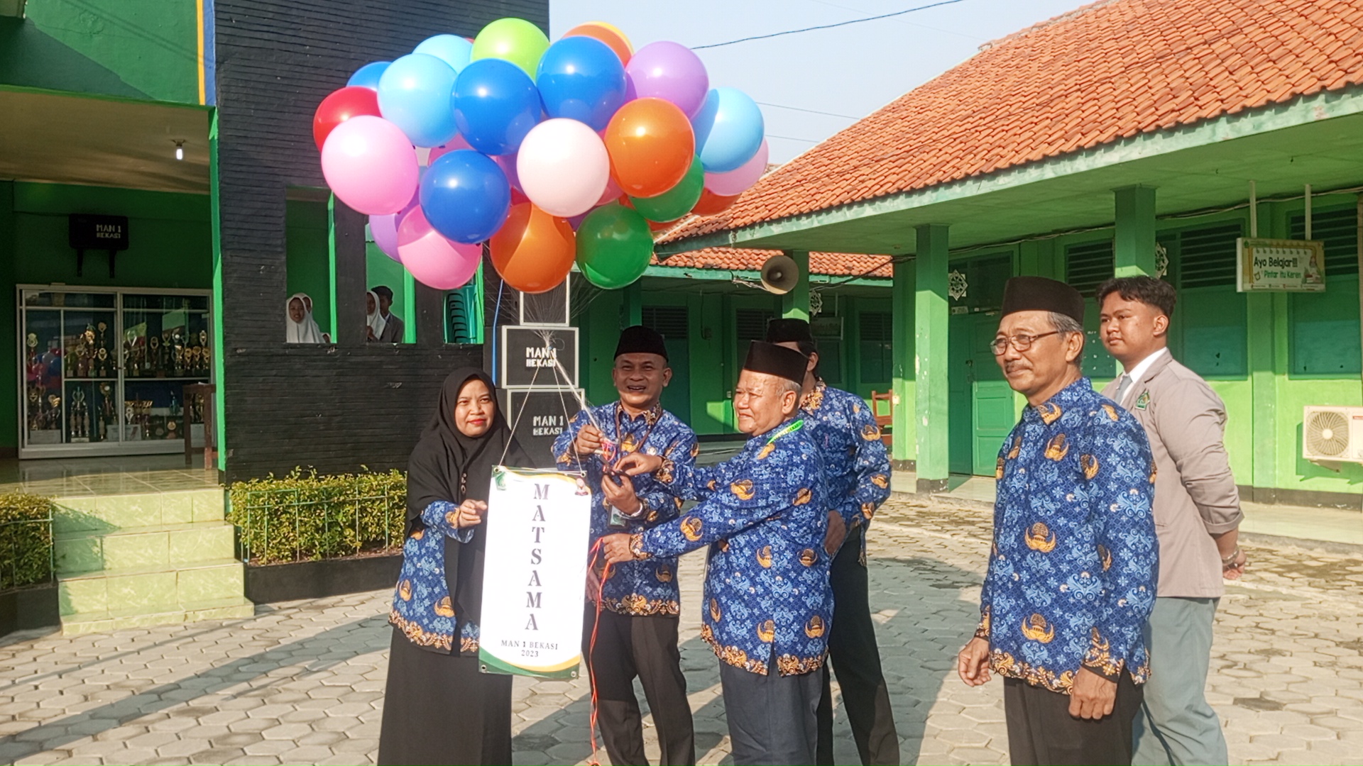 Dari pantauan di lapangan Sebagai tanda dimulainya Matsama, Kakankemenag menyematkan tanda peserta secara simbolis kepada dua siswa baru dan pemotongan Balon sebagai simbolis di bukanya Matsama tahun ajaran 2023/2024 untuk siswa baru MAN 1 Bekasi. (HR)